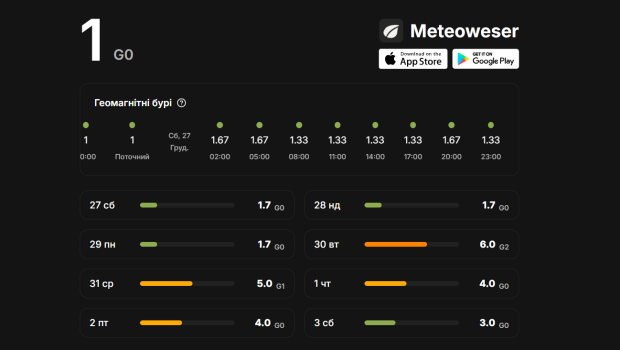 За даними ресурсу Meteoweser, у суботу, 27 грудня, магнітна буря досягне рівня 1,7 бала, що вважається помірним впливом на організм.